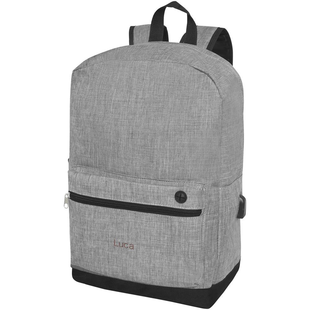 Plecak na laptopa z przednim panelem w kolorze melanżowym oraz tylnym panelem i dolną częścią w kolorze czarnym.