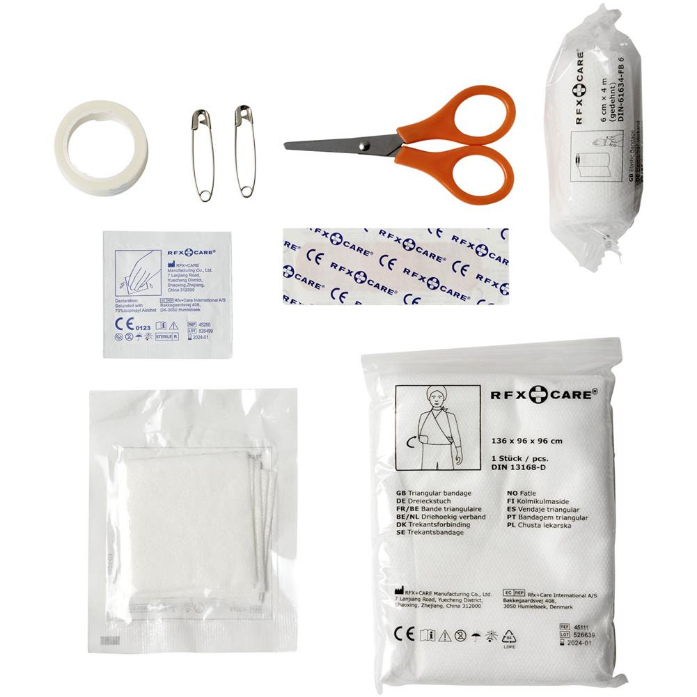 Etui EVA zawiera: 4 waciki z alkoholem, 1 gąbkę non woven, 5 plastrów opatrunkowych, 1 plaster bez opatrunku, 1 bandaż, nożyczki, 2 agrafki i 1 chustę trójkątna. Produkt zgodny z normą EN13485.