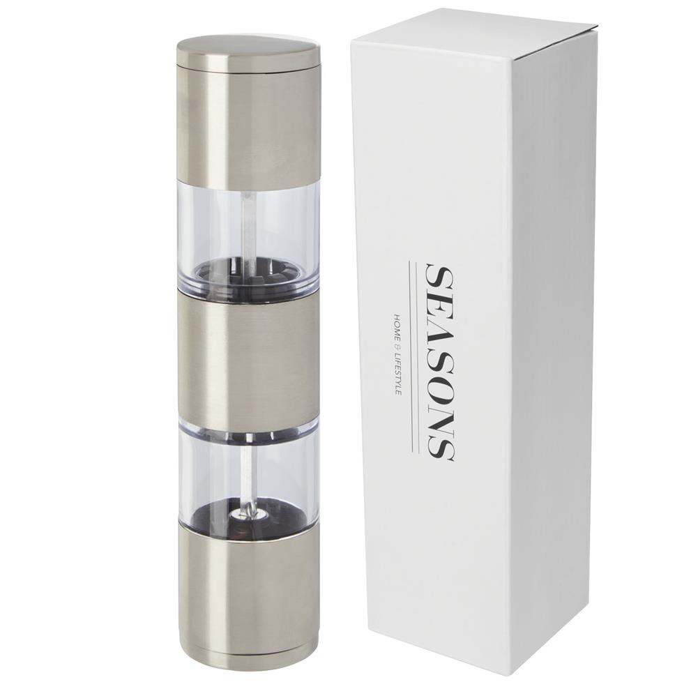 2-stronny młynek z jedną końcówką do soli i drugą do pieprzu. Pieprz i sól nie wchodzą w skład zestawu.