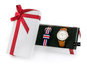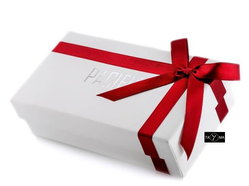 W komplecie dodatkowy parciany pasek w kolorach białym, czerwonym i granatowym oraz gustowne pudełko prezentowe