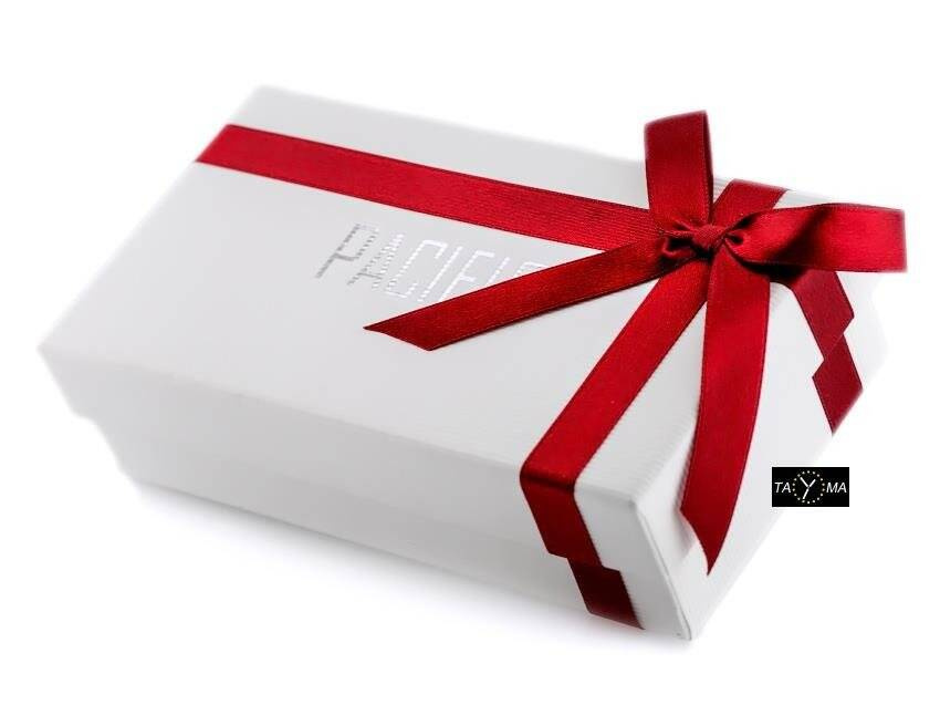 W komplecie dodatkowy parciany pasek w kolorach białym, czerwonym i granatowym oraz gustowne pudełko prezentowe
