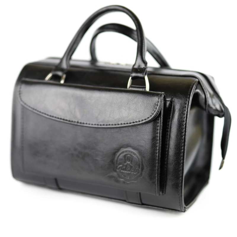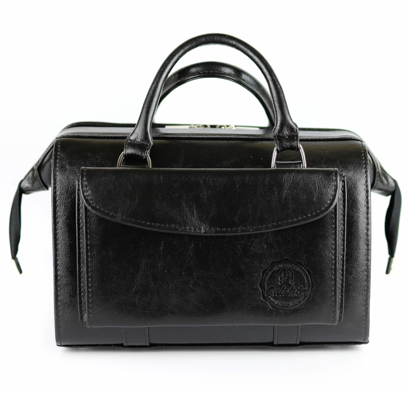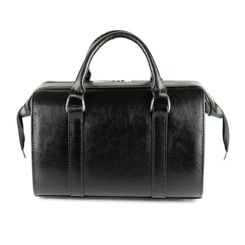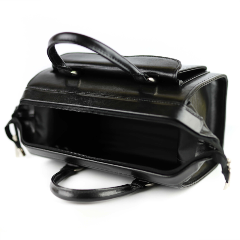 Na przodzie stworzyliśmy elegancką kieszonkę zapinaną na klapkę z jednym magnesem. Kuferek ma dwie skórzane rączki.