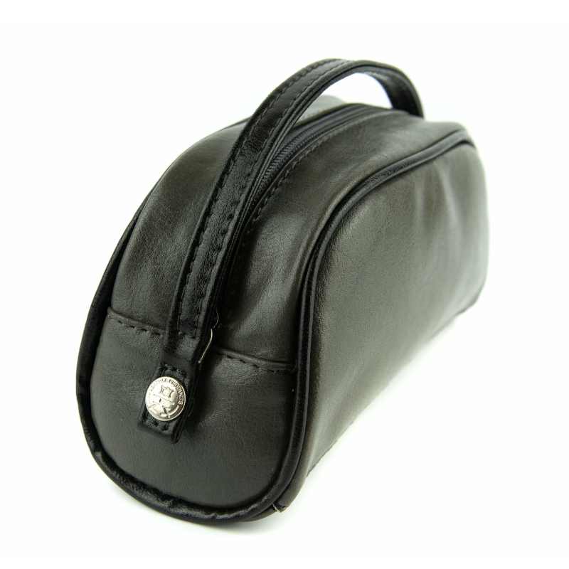 Wyjątkowa owalna kosmetyczka z ozdobnym zapięciem w postaci skórzanego paseczka na nit.