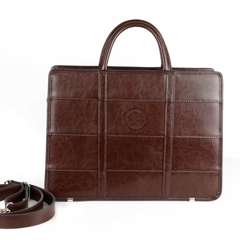 Po bokach teczka ma doczepione skórzane uchwyty, do których możesz przyczepić pasek, będący w zestawie.