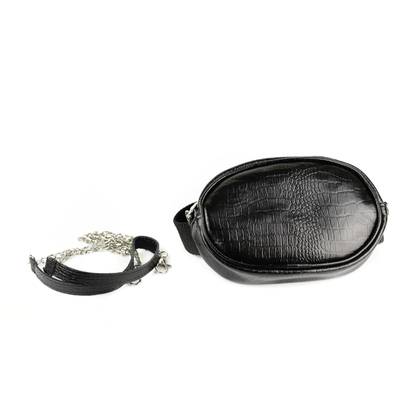 Po bokach do torebki umocowany jest odpinany na karabińczyki łańcuszek. Naszą nerko-torebkę zrobimy dla Ciebie z kilkunastu kolorów i wzorów skór bydlęcych.