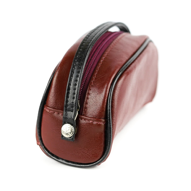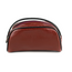 Wyjątkowa owalna kosmetyczka z ozdobnym zapięciem w postaci skórzanego paseczka na nit.