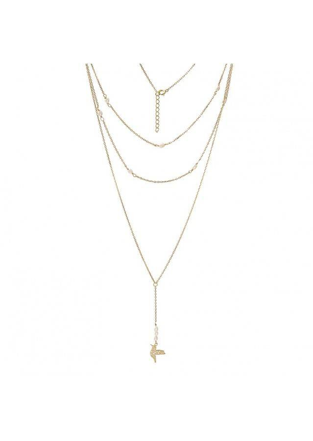 Naszyjnik wykonany ze srebra próby 925 , pozłacanego 24 karatowym, żółtym złotem Kamień: Kamień księżycowy + Hematyt + Kryształ górski Rozmiar kamienia: 4 mm Długość :szyja: 46 cm + przedłużka do 49 cm OPAKOWANIE W CENIE