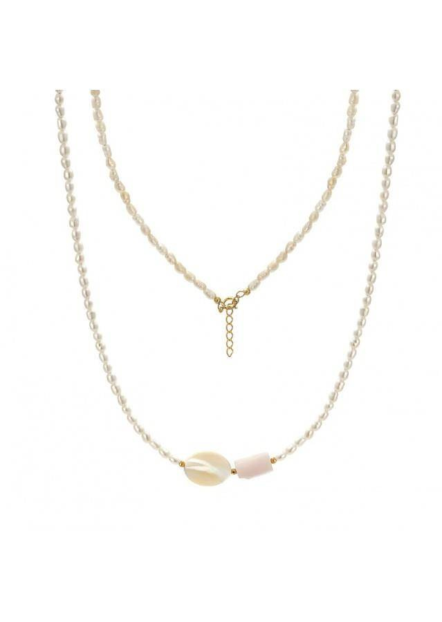 Naszyjnik wykonany ze srebra próby 925 , pozłacanego 24 karatowym, żółtym złotem Kamień: Hematyt + Masa perłowa +perła + morganit Rozmiar kamienia: 4 mm/2mm + bryłka morganitu i masy Długość :szyja: 45 cm + przedłużka do 49 cm OPAKOWANIE W CENIE