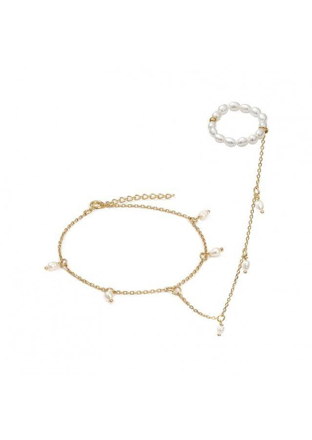 Bransoletka wykonana ze srebra próby 925 , pozłacanego 24 karatowym, żółtym złotem Kamień: perła Rozmiar kamienia: 4 mm/2mm Długość :szyja: 17,5 cm + przedłużka do 19,5 cm / łańcuszek ok. 10,5 cm, pierścionek elastyczny rozmiar uniwersalny OPAKOWANIE W CENIE