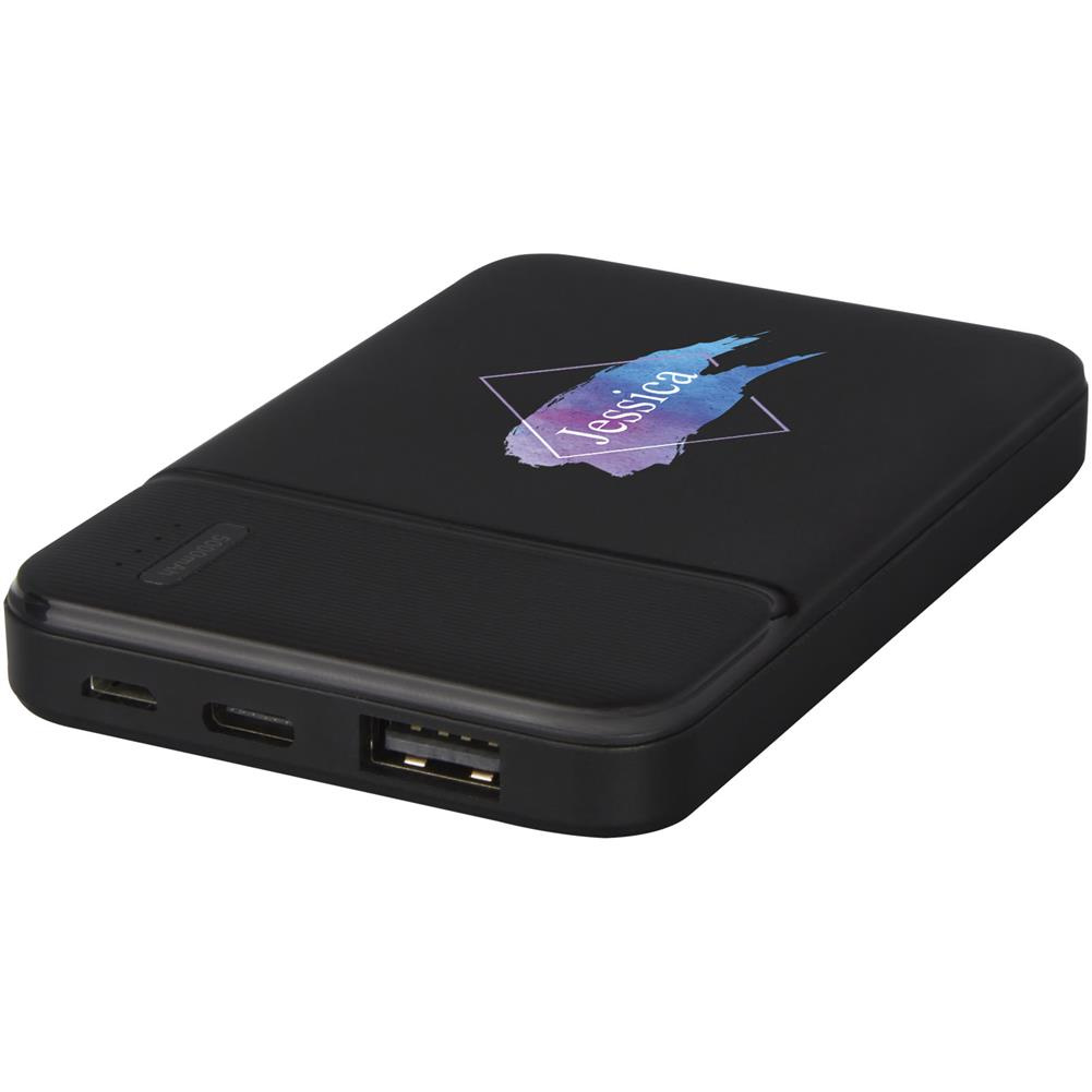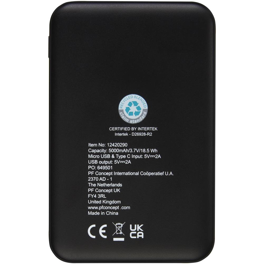 Powerbank wykonany z certyfikowanego przez RCS plastiku ABS pochodzącego z recyklingu. RCS (Recycled Claim Standard) to standard pozwalający zweryfikować zawartość produktów pochodzących z recyklingu w całym łańcuchu dostaw. W powerbanku znajduje się wytrzymała bateria litowo-polimerowa klasy A o pojemności 5000 mAh. Wskaźniki mocy wskazują pozostały poziom energii, dzięki czemu zawsze wiesz, kiedy należy ponownie naładować urządzenie. Wejście typu C 5 V / 2 A, wyjście Micro USB 5 V / 2 A, wyjście USB 5 V / 2A. Brak kabla do akcesoriów ze względów ekologicznych. Dostarczane w pudełku upominkowym wraz z instrukcją obsługi (oba te przedmioty wykonane są z materiałów ekologicznych).
