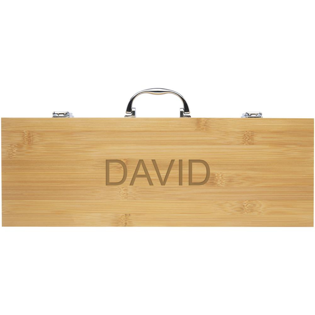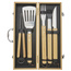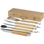 Bambusowy, 5-częściowy zestaw do grillowania z łopatką (40 x 9,5 cm), szczypcami (34,5 x 6 cm), widelcem (38,5 x 3 cm), nożem (38,5 x 3 cm) i szczotką (38 x 4,3 cm). Zestaw jest dostarczany w bambusowym pudełku upominkowym (46 x 16,2 x 7,4 cm). Uchwyty i pudełko upominkowe są wykonane z bambusa, który jest pozyskiwany i produkowany zgodnie z zasadami zrównoważonego rozwoju.