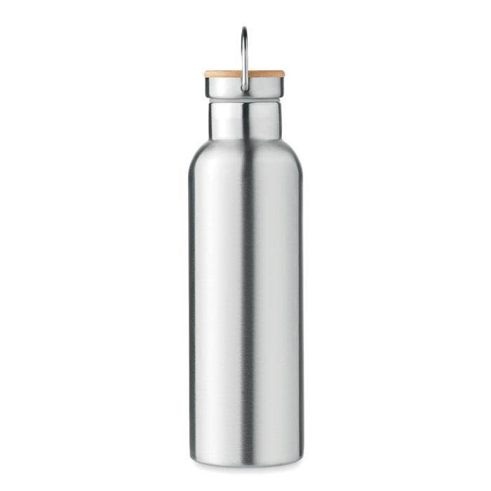 Termos z podwójną ścianką ze stali nierdzewnej z bambusową pokrywką i uchwytem.