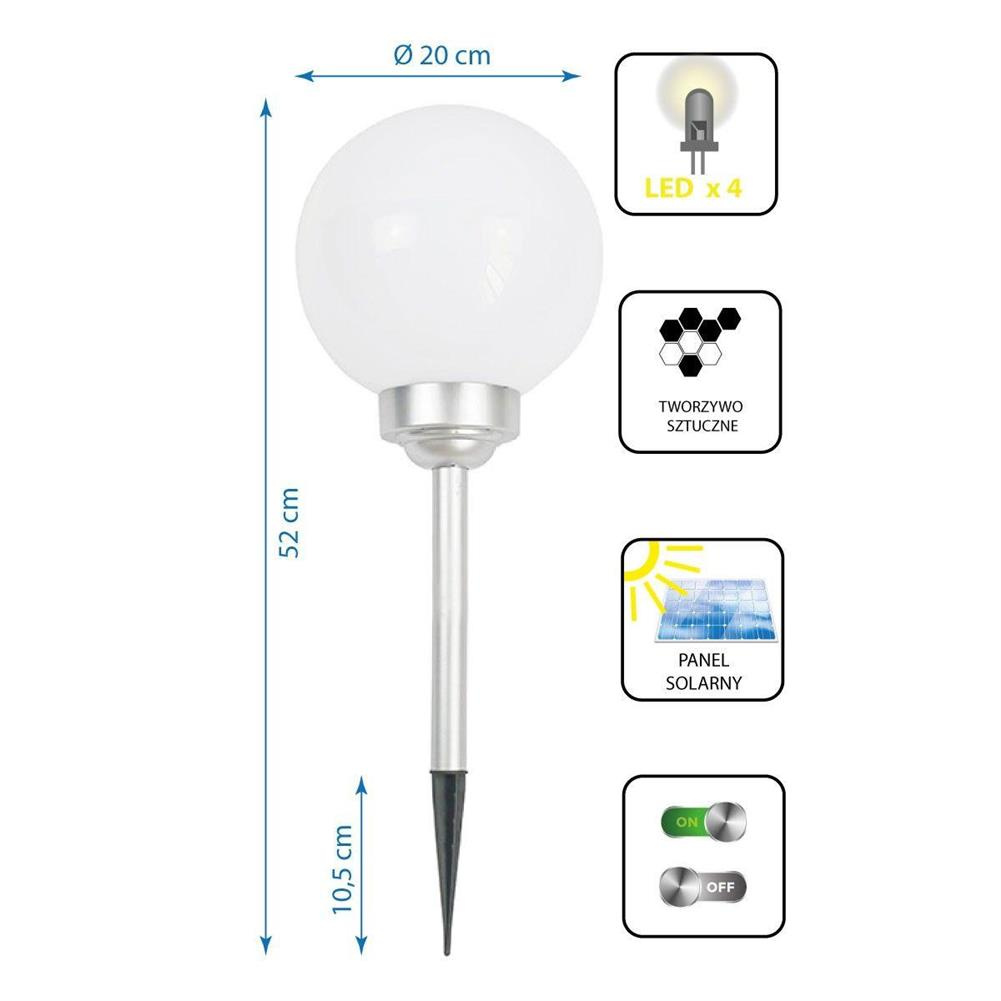 OGRODOWA LAMPA SOLARNA KULA MLECZNA ŚR. 20CM 4 LED to praktyczne i niedrogie źródło światła, które sprawdzi się przede wszystkim na zewnątrz. Możesz ją wykorzystać jako podświetlenie elewacji, trawnika, tarasu, balkonu, podjazdu, basenu czy też do podświetlenia altanki lub chodnika. Wystarczy tylko wbić gruby grot w podłoże w odpowiednio oświetlonym miejscu. Sercem lampy jest panel solarny ukryty pod kloszem, którego zadaniem jest gromadzenie energii ze słońca w ciągu dnia i przechowywanie jej w akumulatorze. Energia jest uwalniana w postaci światła dopiero gdy na zewnątrz zapadnie zmierzch. Odpowiedzialny za to jest wbudowany czujnik zmierzchu. To praktycznie darmowa i ekologiczna forma oświetlenia płacisz jedynie za lampę. OGRODOWA LAMPA SOLARNA KULA MLECZNA ŚR. 20CM 4 LED sprawdzi się też w miejscach, gdzie nie masz możliwości założenia instalacji elektrycznej, a chciałbyś je nieco rozświetlić. Jej WODOODPORNA obudowa sprawi, że będzie rozświetlać co tylko zamarzysz przez długi czas.