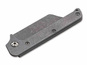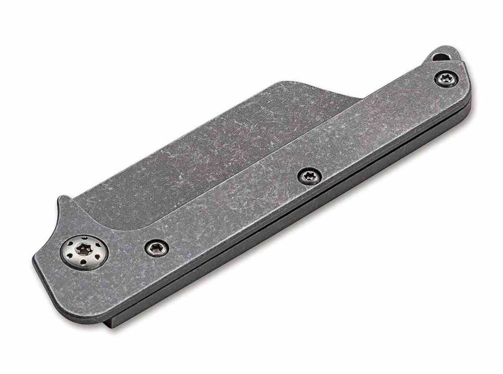 Poręczny nóż całkowicie rezygnuje z przedniej okładki i opiera się na minimalistycznej konstrukcji, która łączy śrubę osi ostrza z tylnym uchwytem.