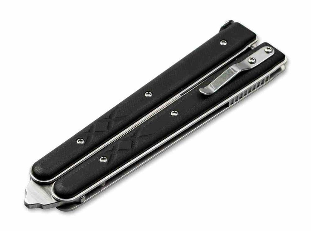 Nowa wersja motylka Boker Plus to klasyczna dwuramienna konstrukcja z rękojeścią wykonaną ze stali nierdzewnej obleczoną w tworzywo G10.