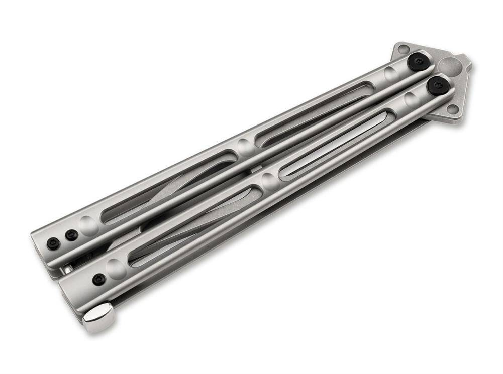 Boker Plus Papillon Trainer odpowiada konstrukcji prawdziwego noża Balisong, ale jest wyposażony w tępą atrapę zamiast prawdziwego ostrza.