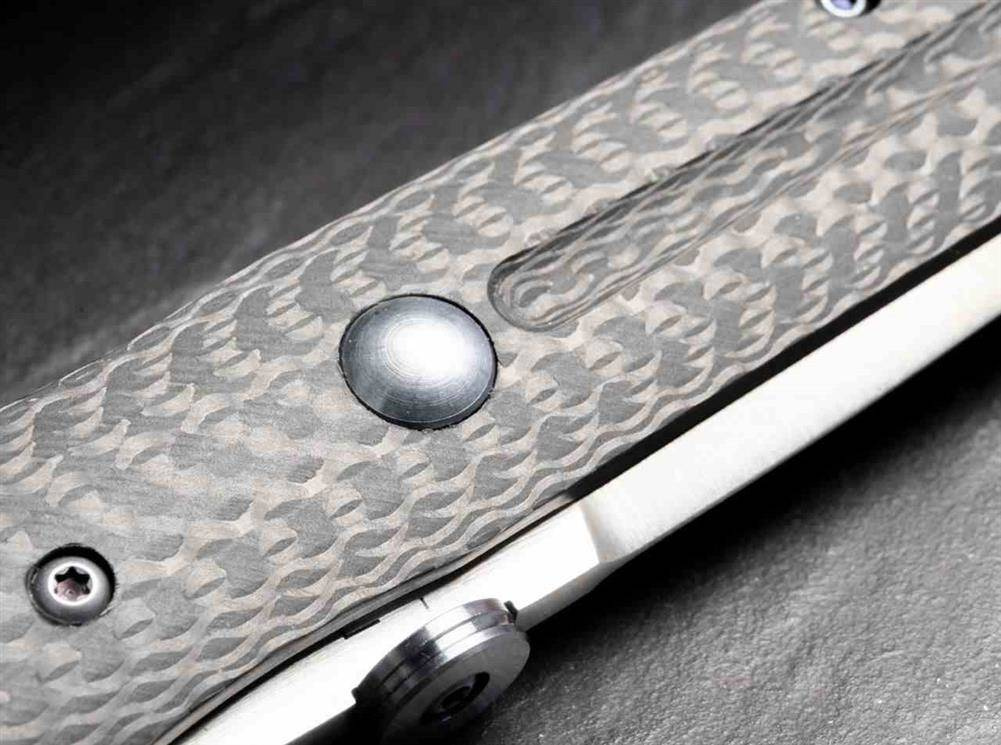 Wkładka, śruby i zdejmowany tytanowy krążek kciuka są anodowane w kolorze lodowoniebieskim, dzięki czemu idealnie pasują do koloru obrabianego maszynowo tytanowego klipsa (tip-up/r) oraz kulki w skali przedniej rękojeści, która również jest wykonana z tytanu.
