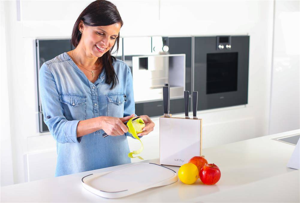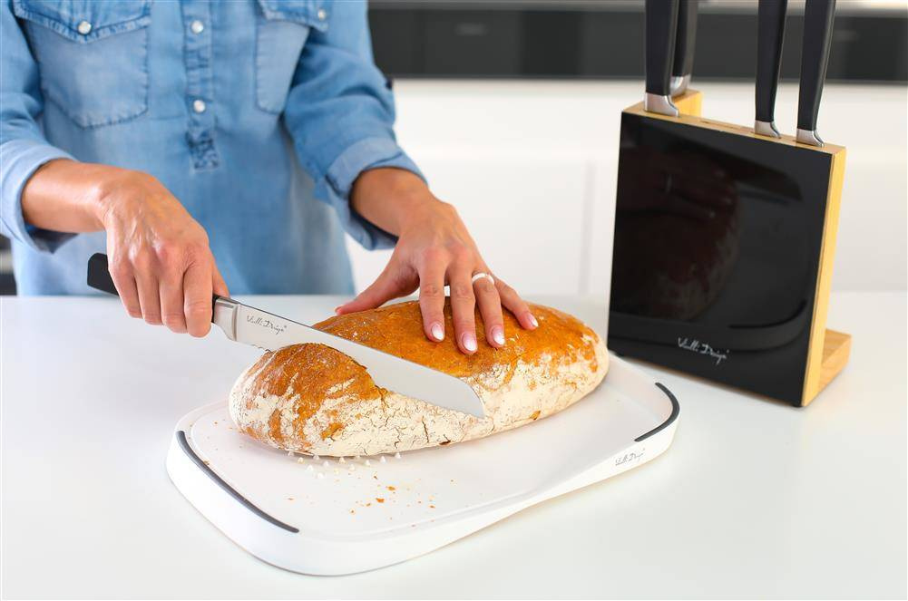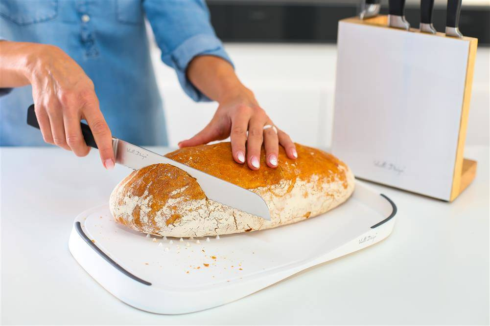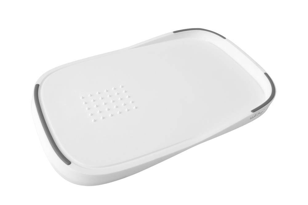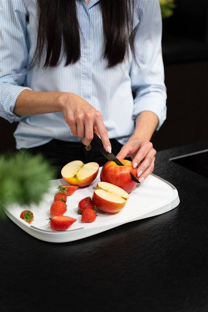 Dzięki temu, że powierzchnia jest nachylona pod niewielkim kątem, soki oraz okruszki zbierają się na dole deski, a ty możesz wygodnie kroić dalej.