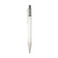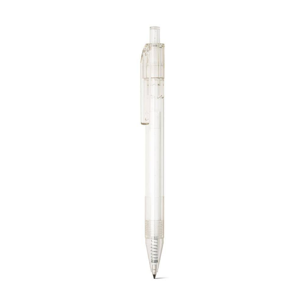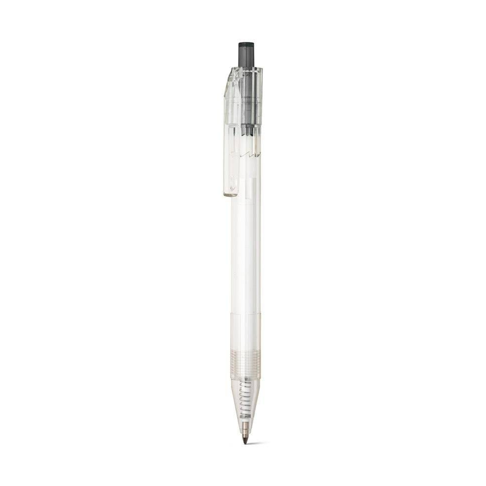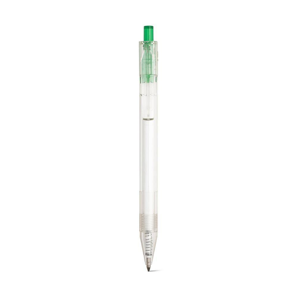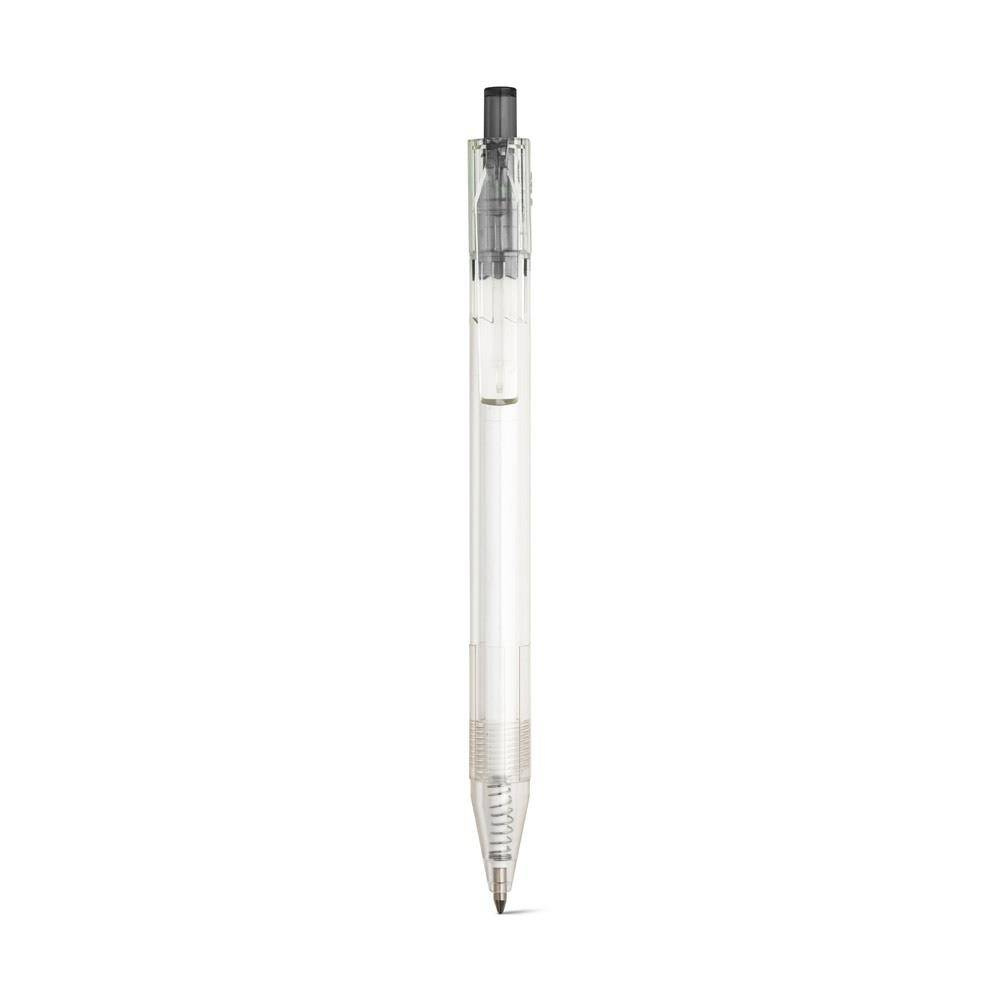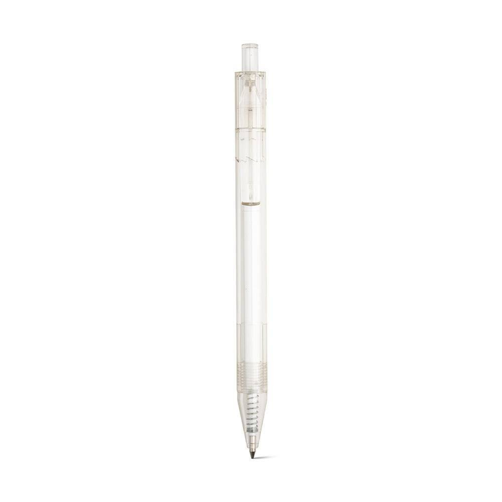 Długopis z przezroczystego materiału z recyklingu PET z kolorowym przyciskiem.
