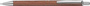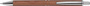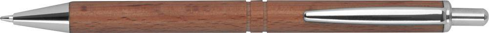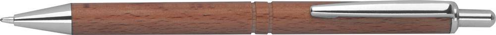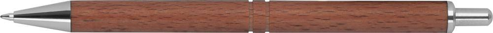 Długopis z naturalnego, polerowanego drewna oraz metalu, z wkładem piszącym na niebiesko.