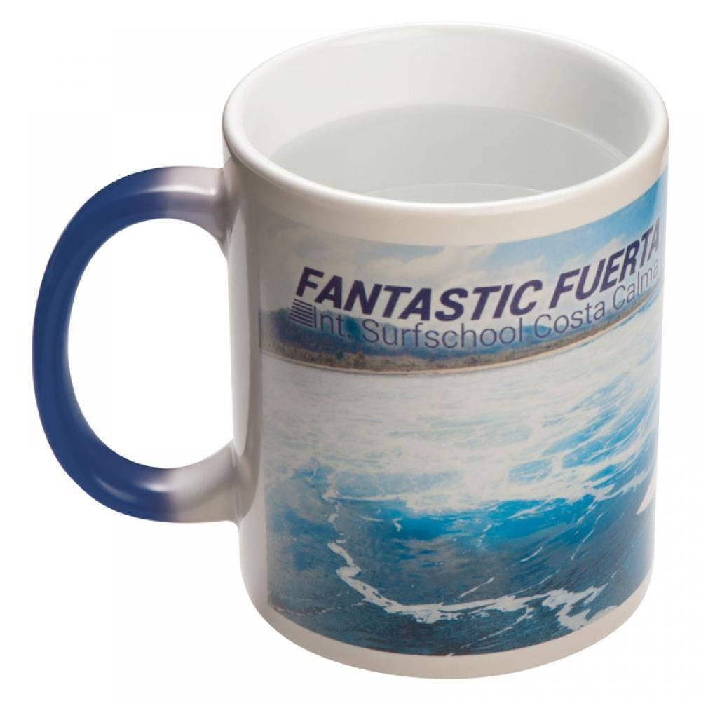 Efektowny kubek ceramiczny do sublimacji - kiedy jest zimny, nie widać nadruku, ale po wypełnieniu go ciepłym napojem reklama staje się widoczna.