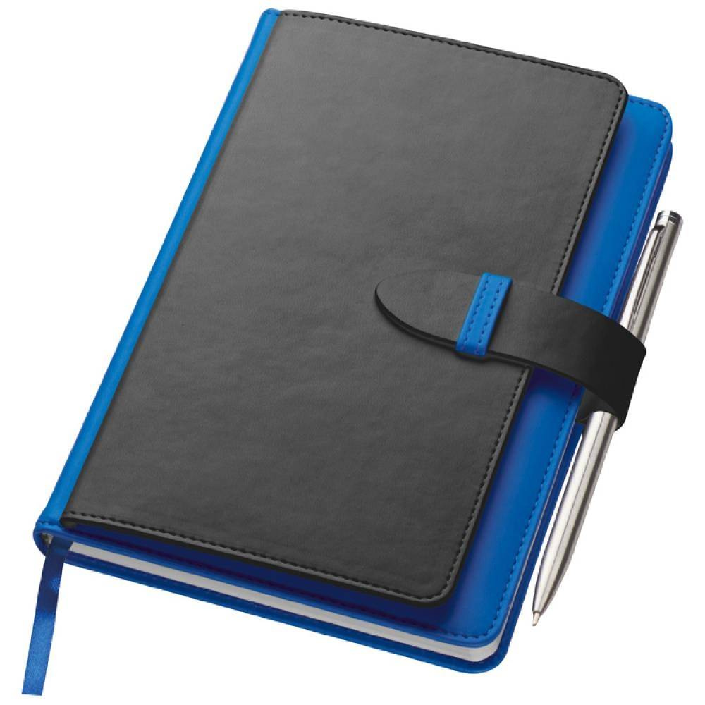 Notatnik A5 w okładce z PU, ze 128 kartkami w linie, miejscem na długopis i wizytownikiem na 5 wizytówek.