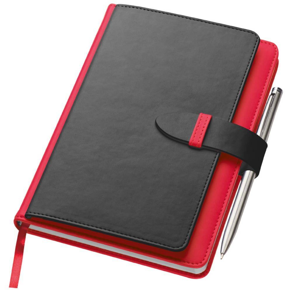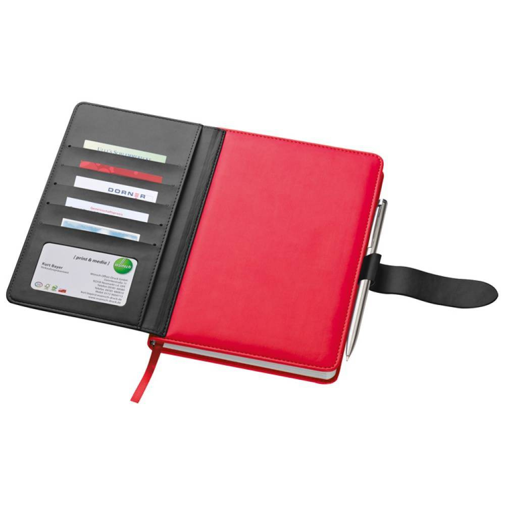 Notatnik A5 w okładce z PU, ze 128 kartkami w linie, miejscem na długopis i wizytownikiem na 5 wizytówek.