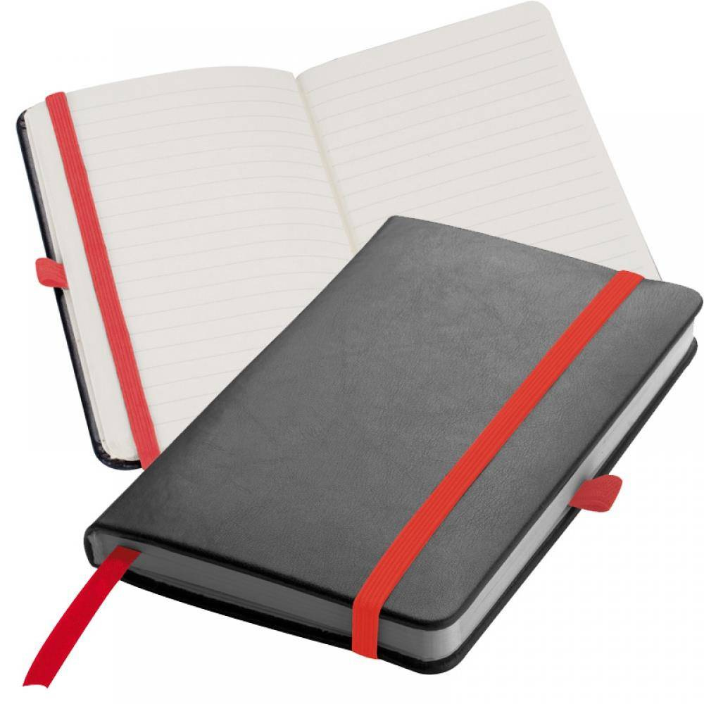 Notatnik A6 w okładce ze skóry syntetycznej, ze 160 stronami w linie, zakładką, pętelką na długopis i gumką do zamykania.