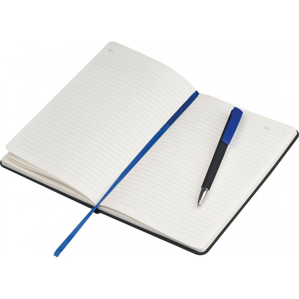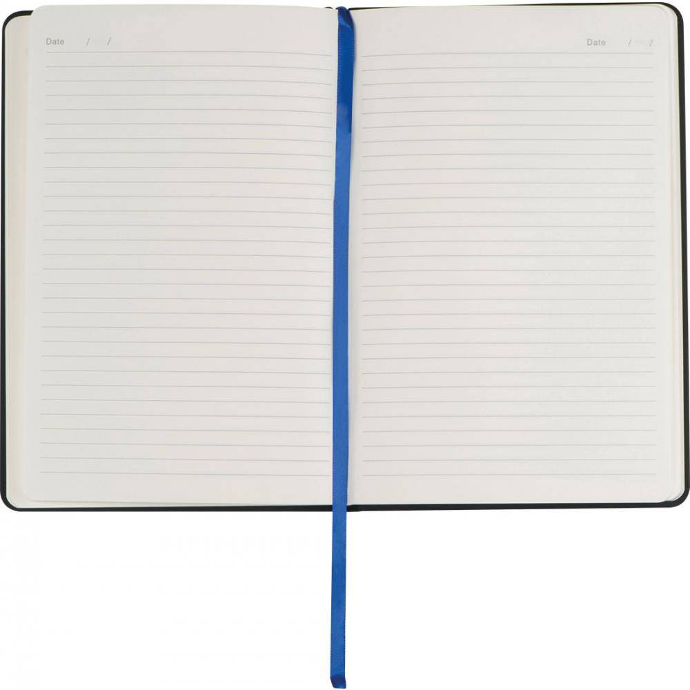 Notatnik A5 z okładką z PU i 192 stronami w linie, zakładką, miejscem na długopis oraz zamknięciem na gumkę.