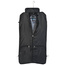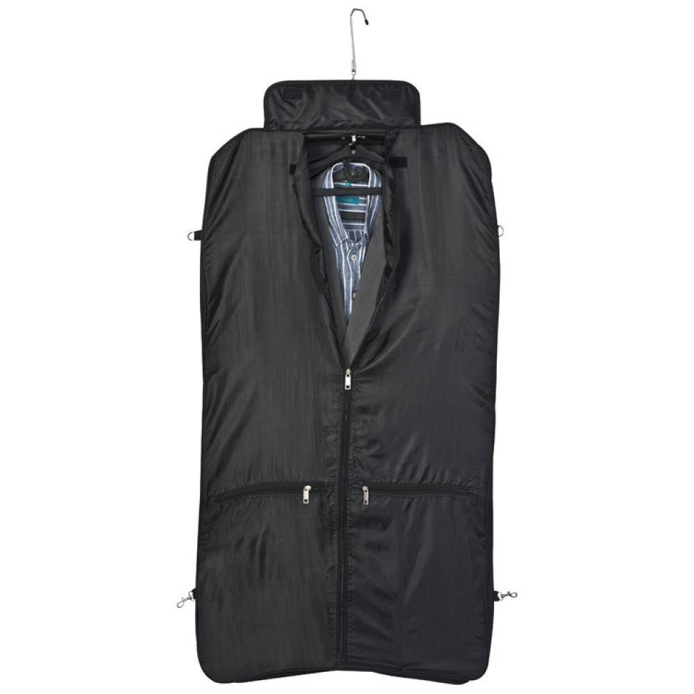 Duży pokrowiec na ubrania wykonany z mocnego poliestru, wyposażony w uchwyt, pasek na ramię oraz dodatkową kieszeń i metalową plakietkę na etykiecie ze skóry syntetycznej.
