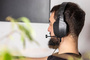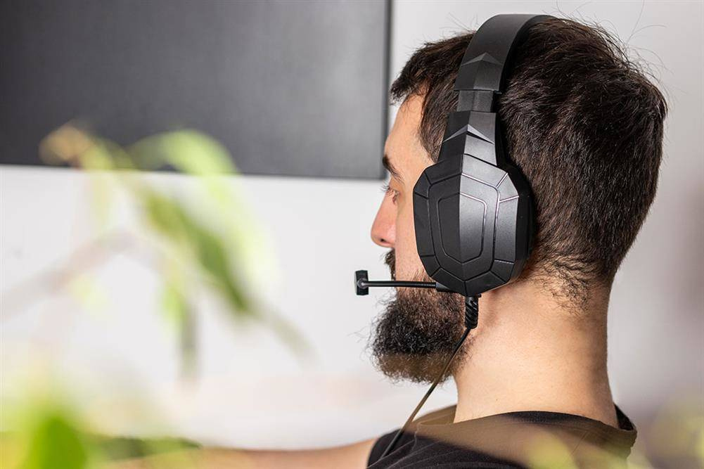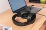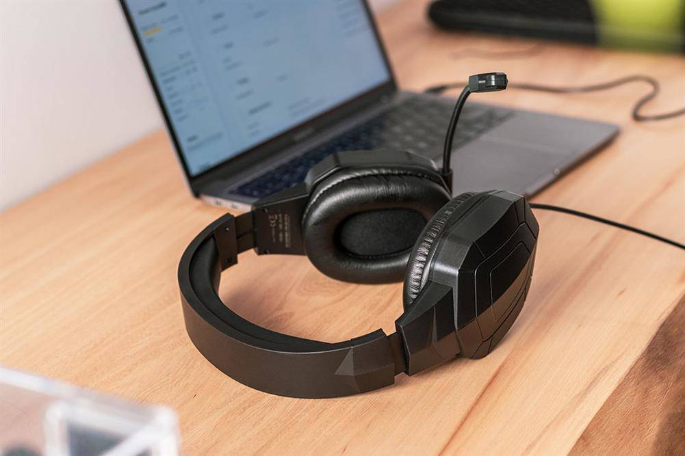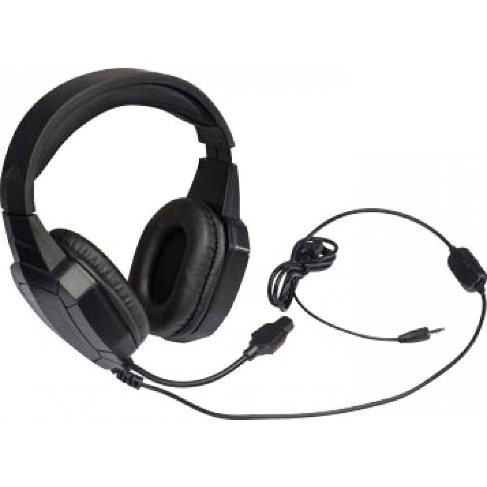 Zestaw słuchawkowy z plastiku, z mikrofonem i regulacją głośności, oraz funkcją redukcji szumów.