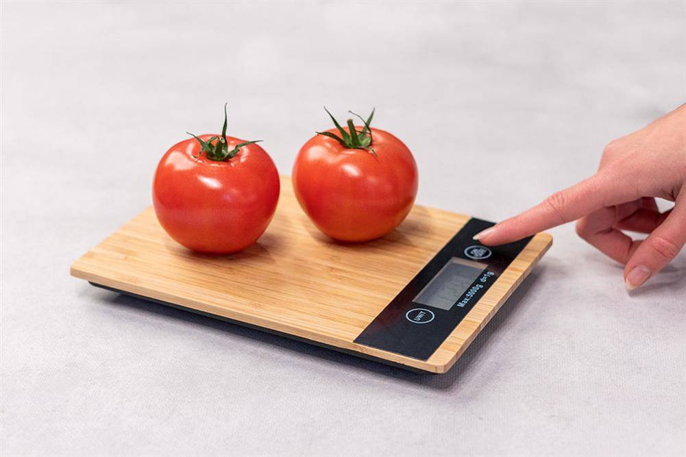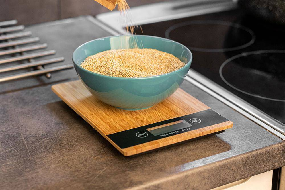 Waga kuchenna wykonana z bambusa z cyfrowym wyświetlaczem. Pomiary mogą być wyświetlane w kg / g / oz / ml z precyzją do 1g.