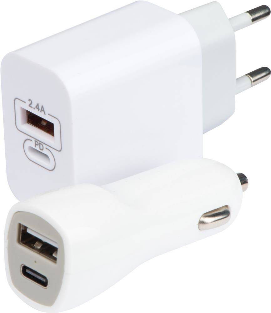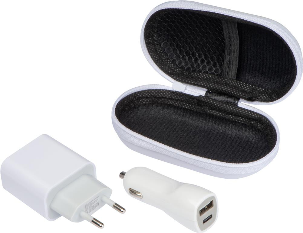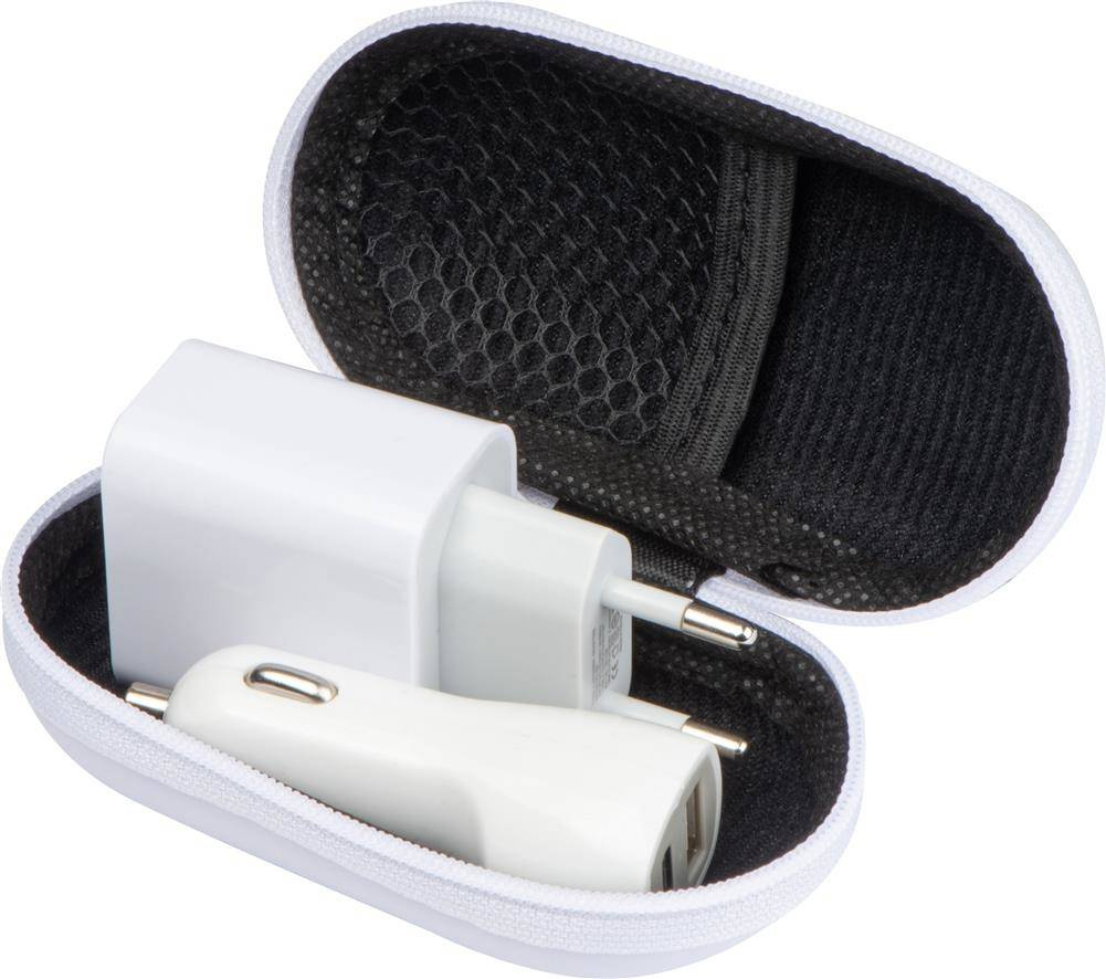 Zestaw z PU, plastiku i metalu, zawierający ładowarkę samochodową oraz tradycyjną ładowarkę podłączaną do gniazdka (zestaw nie zawiera kabla ładującego). Obie ładowarki posiadają złącza: USB oraz USB typu C. Zestaw zapakowany w zamykane na zamek etui, które posiada w środku praktyczną kieszonkę na drobiazgi.