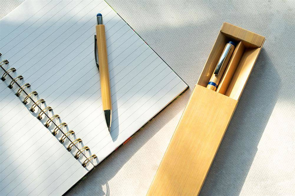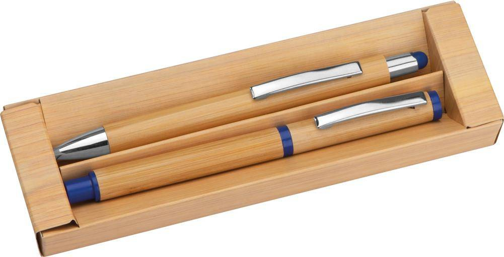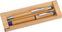 Zestaw z bambusa i metalu. W skład zestawu wchodzą: długopis z niebieskim wkładem oraz ołówek automatyczny.