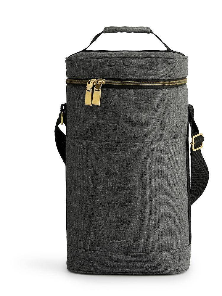 Praktyczna torba termiczna w kolorze szarym z dodatkami w kolorze złotym.