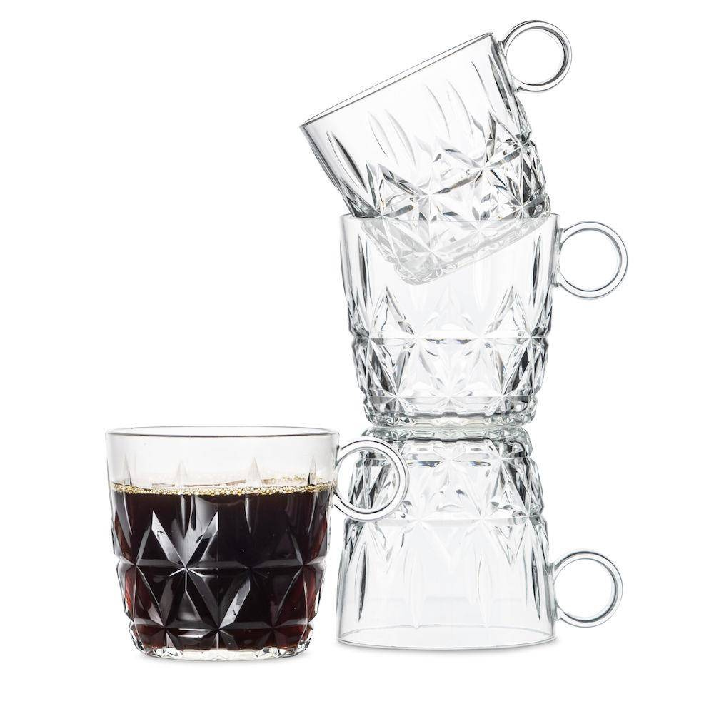 Ten wspaniały kubek do kawy jest wykonany z przezroczystego plastiku z wzorem w szlifie kryształu.