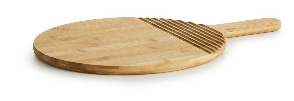 Stylowa, okrągła deska do krojenia z drewna bambusowego z praktycznymi wgłębieniami przy uchwycie.