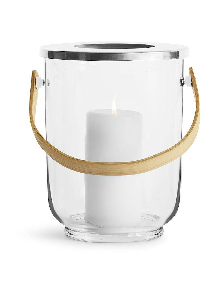 Elegancki świecznik uzyskany przez kompozycje dębu, szkła oraz stali nierdzewnej.