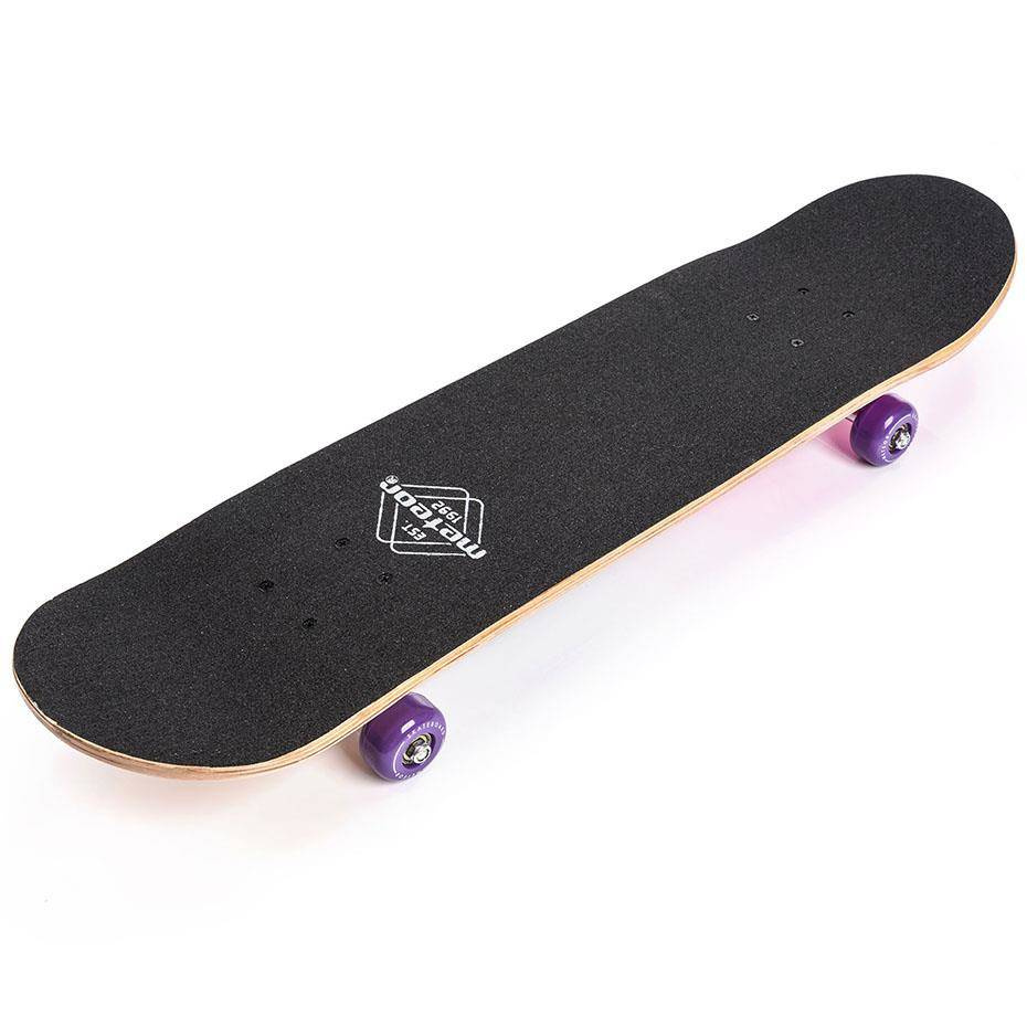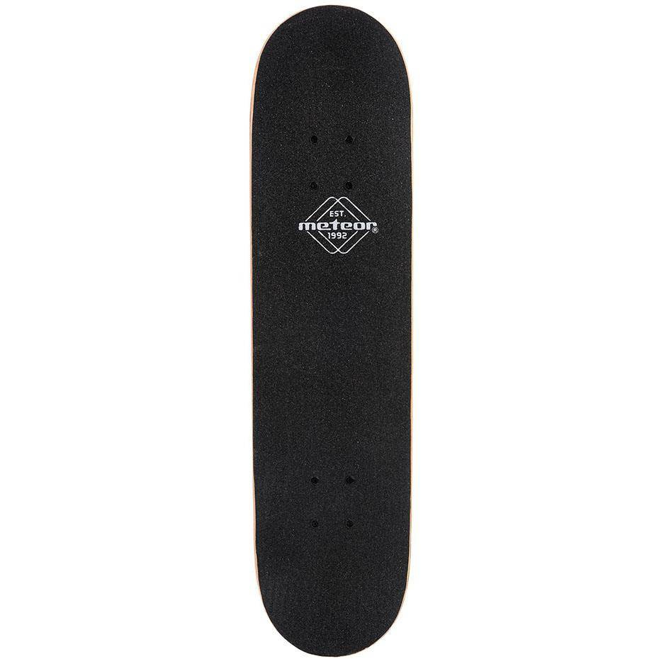 Deskorolka Meteor przeznaczona dla początkujących, młodych miłośników skateboardu sprawdzi się podczas jazdy rekreacyjnej. Deck wykonany z 9 warstw klonu zyskał antypoślizgową powierzchnię. Obustronne wgłębienie. Delikatne profilowanie. Cała konstrukcja jest osadzona na poliuretanowych kółkach polecanych do jazdy na twardych nawierzchniach np. asfalt. Aluminiowe trucki odpowiadają za zwiększoną niezawodność układu jezdnego.
