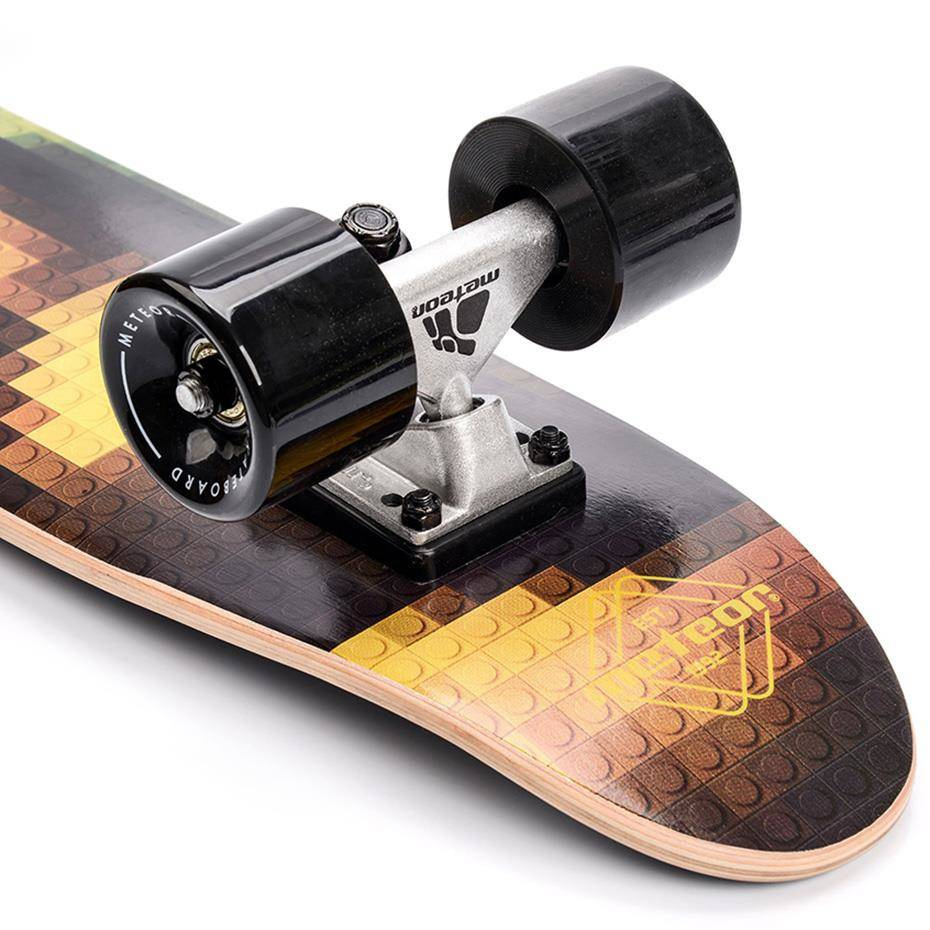Deskorolka Meteor przeznaczona dzieci, młodzieży i dorosłych sprawdzi się podczas rekreacyjnej jazdy. Nawiązuje do winylowych deskorolek z lat 70 i 80. Kompaktowe wymiary. Deck powstał z 7 warstw klonu zapewniającego trwałość. Antypoślizgowa powierzchnia. Poliuretanowe kółka sprawdzą się podczas miejskiej jazdy po zatłoczonych uliczkach. Wysokie, aluminiowe trucki odpowiadają za zwiększoną niezawodność układu jezdnego. Ciekawa grafika.