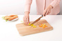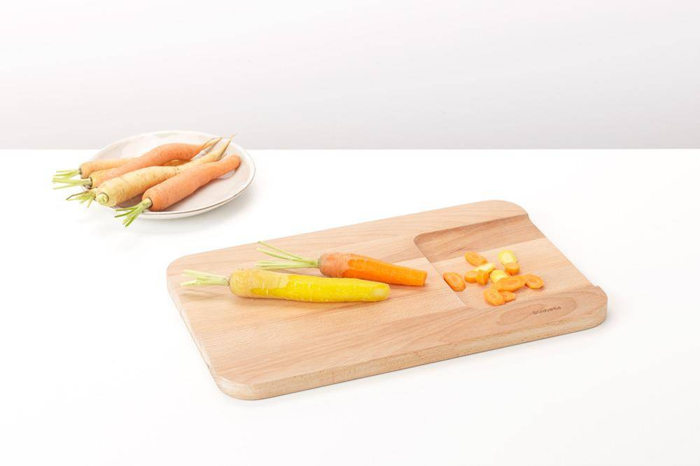 Deska posiada wyprofilowaną część, do której można zebrać pokrojone warzywa, owoce, a następnie z łatwością zsypać je na patelnię lub do miski.