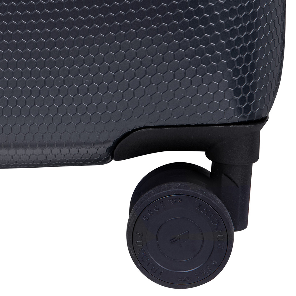 - 4 koła (spinner 360) (koła wykonane z gumy i PVC co dodatkowo wzmacnia je przed uderzeniami zewnętrznymi, oś na której zamocowane zostało koło wzmocniona pyłem diamentowym),