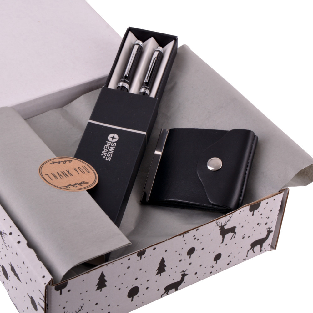 Zestaw prezentowy składa się z zestawu piśmienniczego oraz banknotówki.