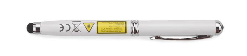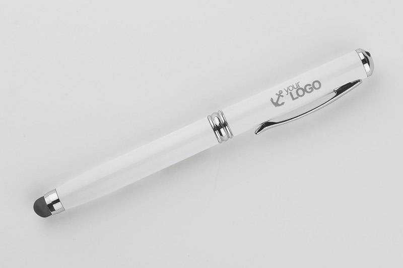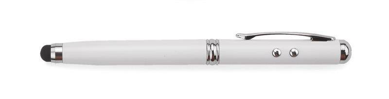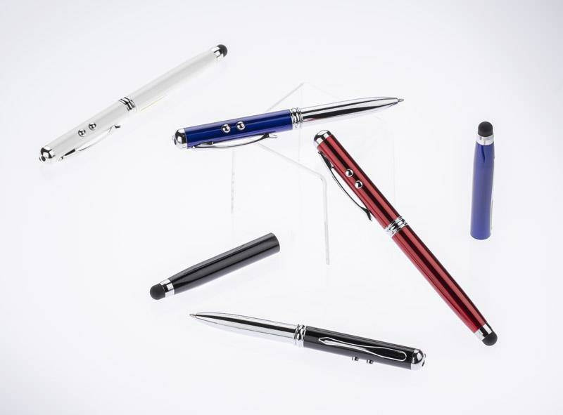 Długopis wykonany z metalu łączący aż cztery praktyczne funkcje: długopis, touch pen, wskaźnik laserowy, latarka.