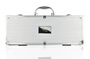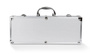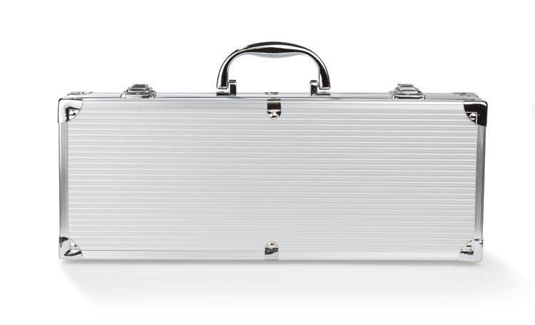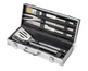Zestaw do grilla pakowany w walizkę: szczypce, łopatka, nóż, widelec i pędzelek.