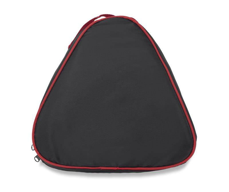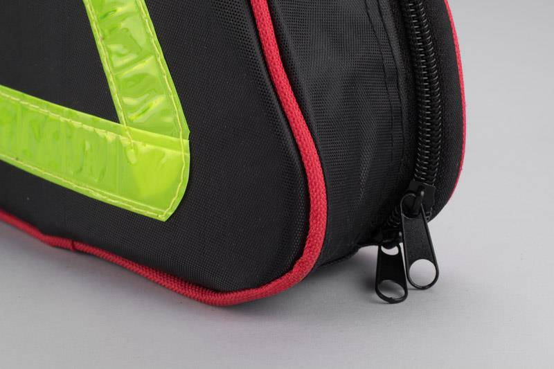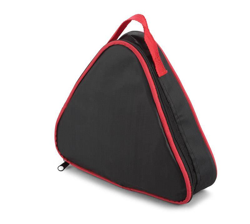 Zestaw narzędzi samochodowych umieszczony w torbie z poliestru, która dzięki swojemu kształtowi może zostać wykorzystana jako trójkąt ostrzegawczy.