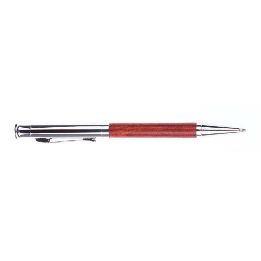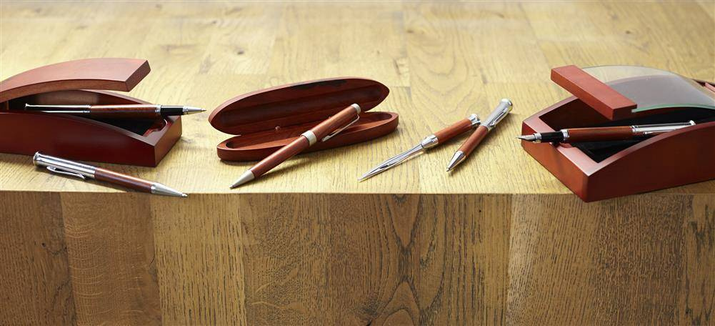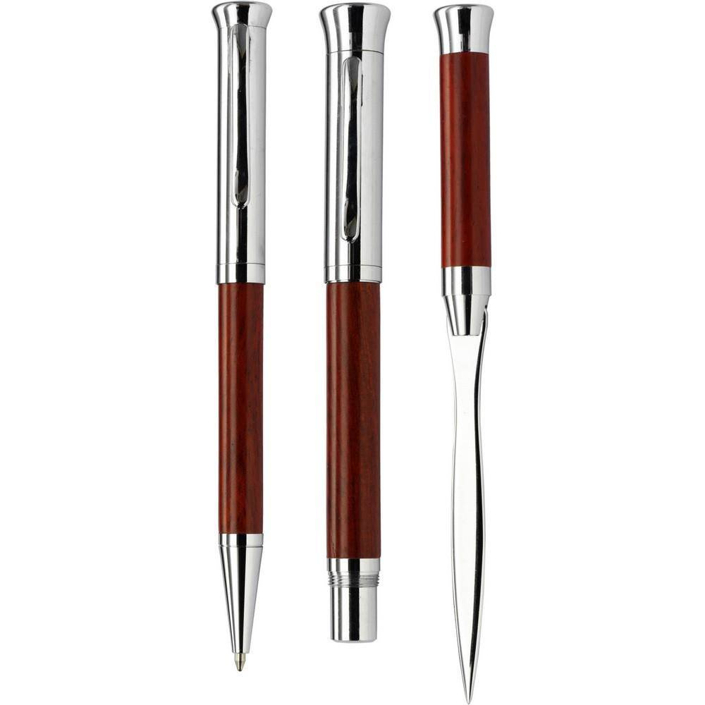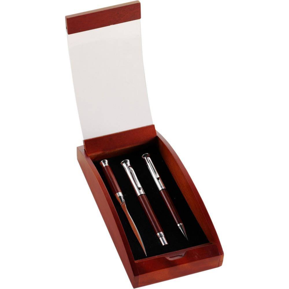 Zestaw piśmienny w drewnianym etui, długopis przekręcany, pióro wieczne i nóż do otwierania listów