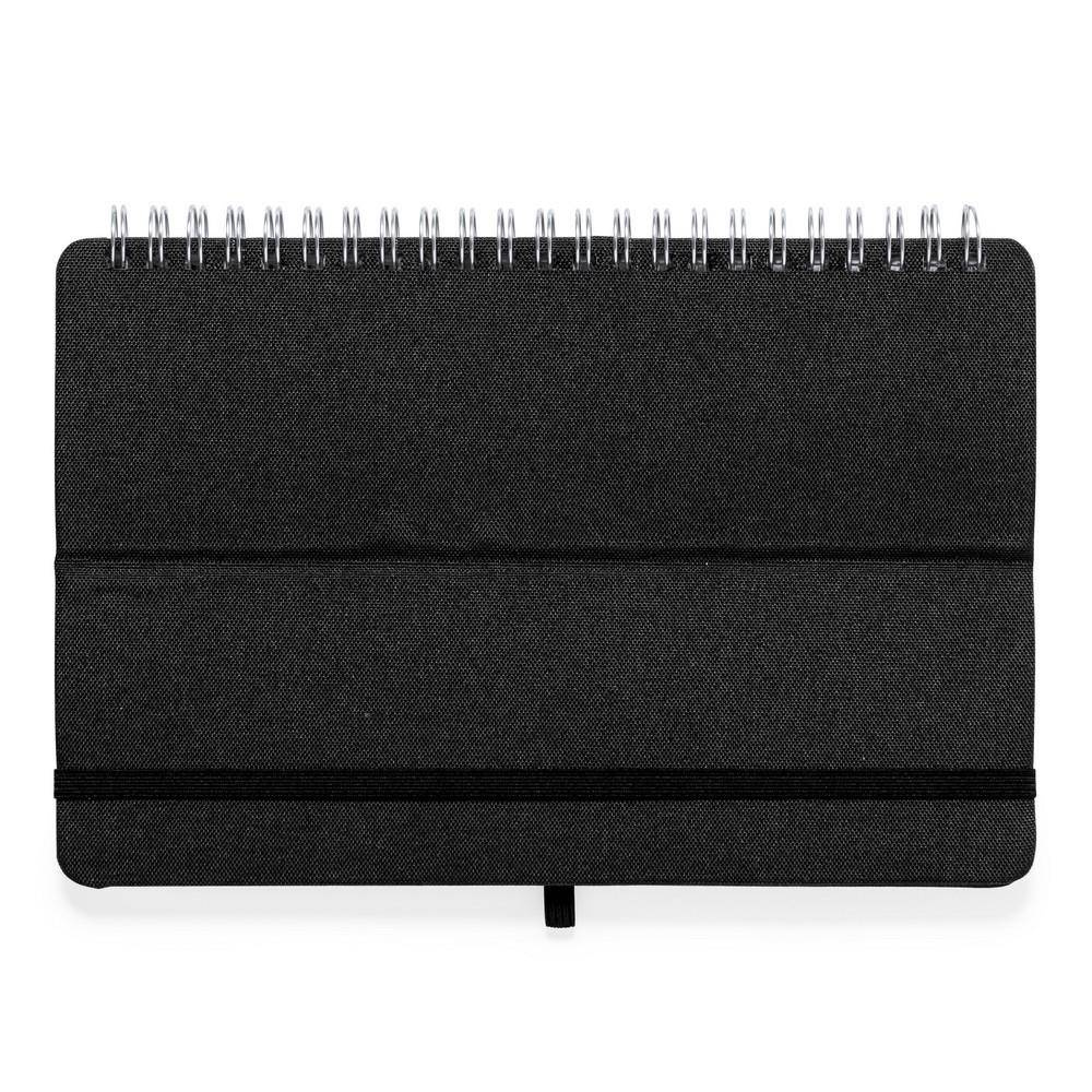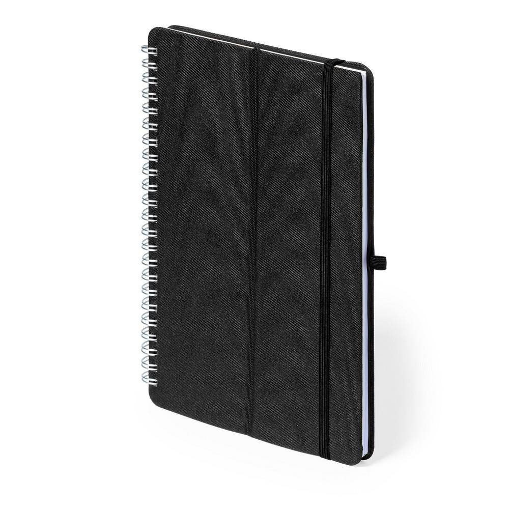 Notatnik RPET (ok. A5, 70 kartek w linie), stojak na telefon, stojak na tablet, twarda okładka, spiralne bindowanie, elastyczna opaska do zamykania