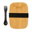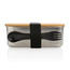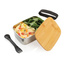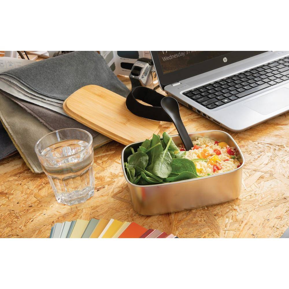 Pudełko śniadaniowe, lunch box o pojemności 1500 ml, wykonane ze stali nierdzewnej, bambusowe wieczko, w komplecie łyżko widelec i elastyczny pasek, można myć