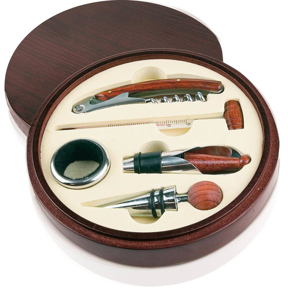 Zestaw do wina 5 el. w drewnianym pudełku, nóż kelnerski, pierścień, zatyczka, nalewak z zamknięciem i termometr.
